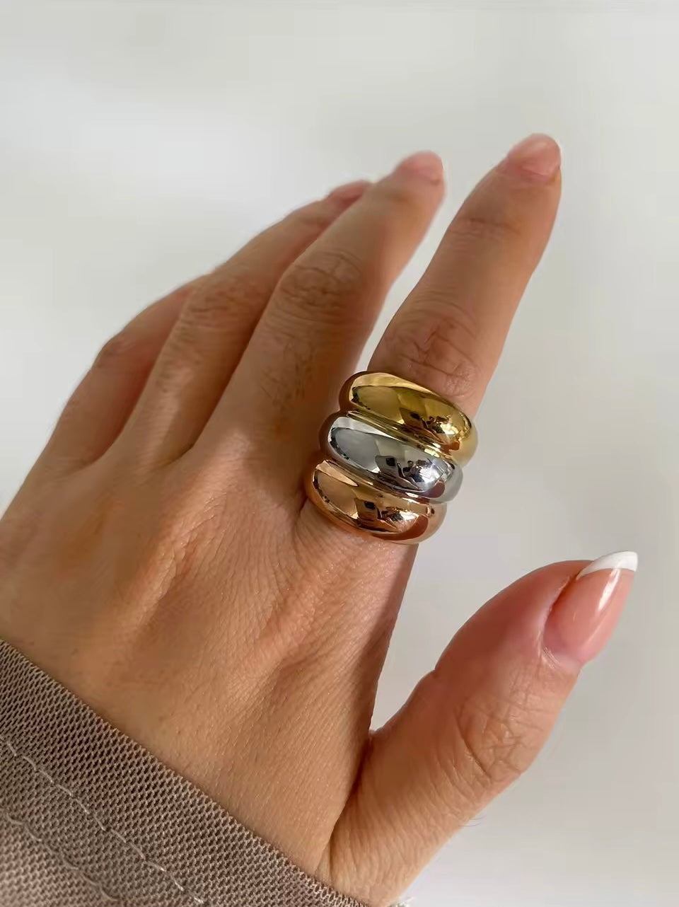 Make a statement with this bold and chunky three-color ring featuring gold, silver, and rose tones. Eye-catching and effortlessly cool, this piece brings together all your favorite metal shades in one unapologetically stylish design.