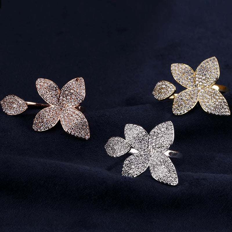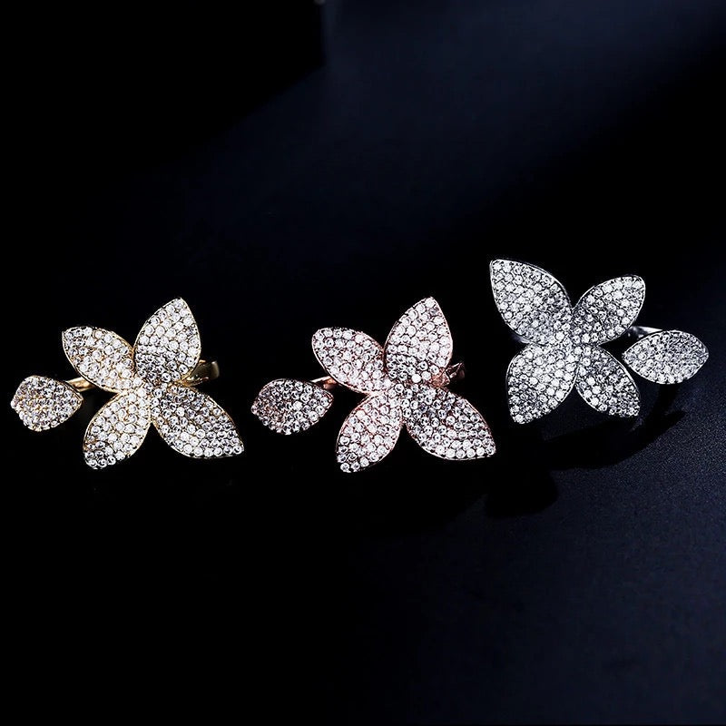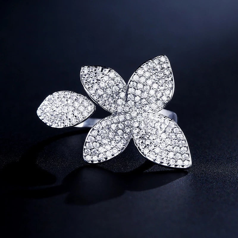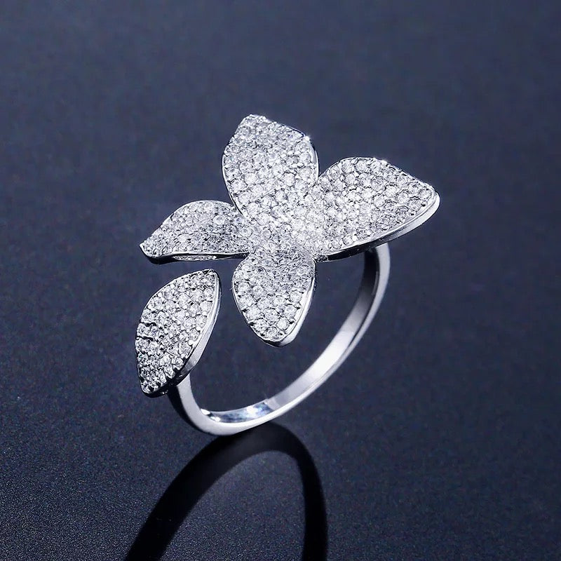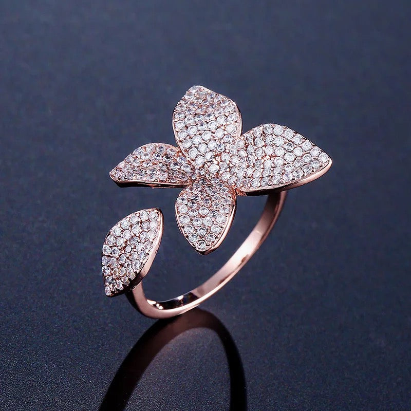 Flower Motif Open Ring In Cubic Zirconia Crystals