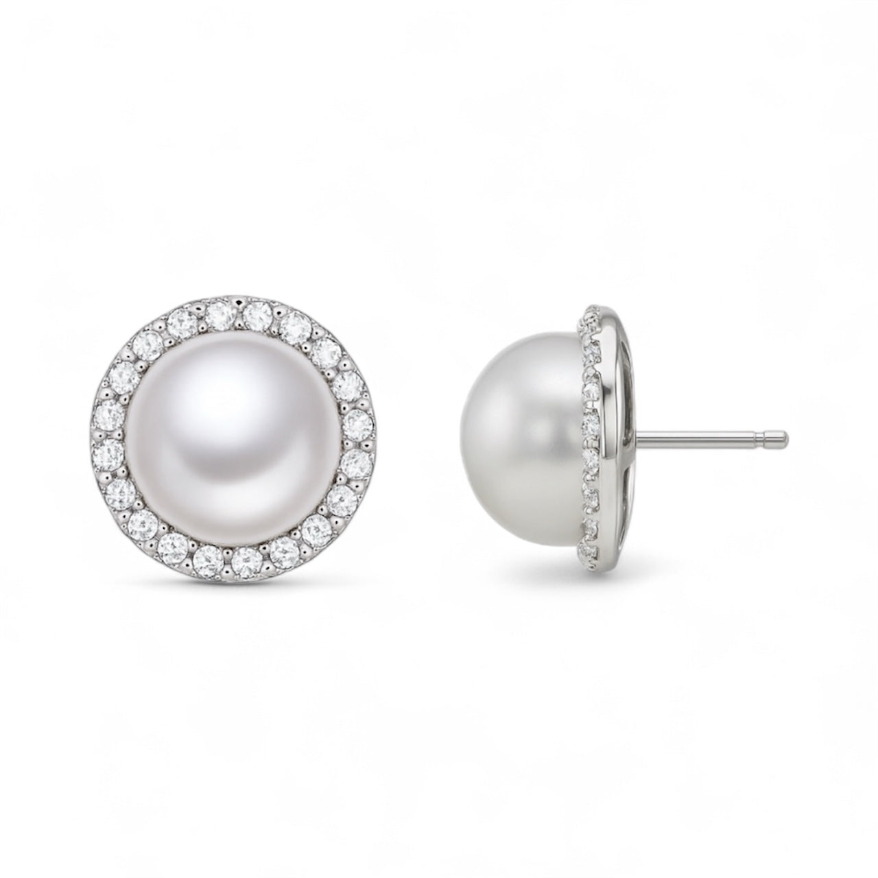 Timeless and sophisticated, these freshwater pearl stud earrings are surrounded by a halo of sparkling cubic accents set in polished sterling silver. The luminous pearls add a touch of classic grace, while the shimmering stones bring a modern sparkle. Perfect for both everyday elegance and special occasions.