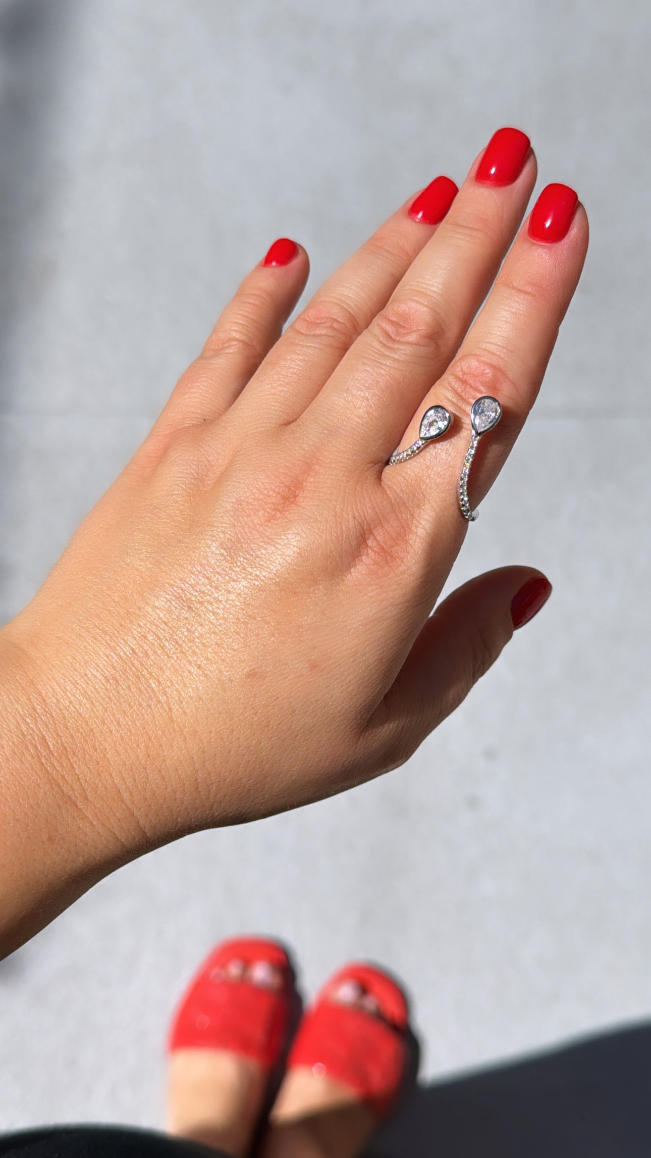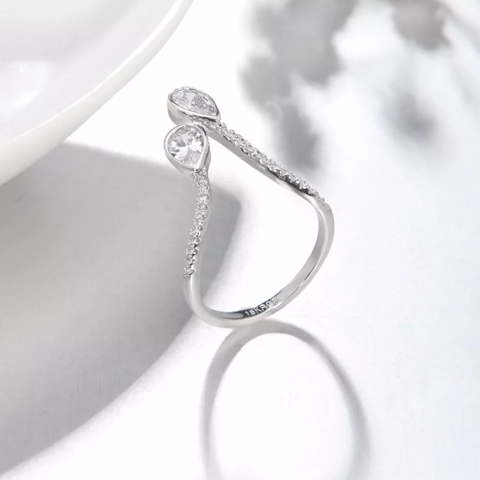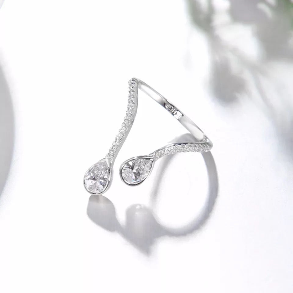 Introducing our elegant Wrap Ring, adorned with stunning teardrop-cut cubic zirconias on both ends. This ring effortlessly wraps around your finger, creating a sophisticated look with a touch of sparkle. Perfect for stacking or making a statement on its own.